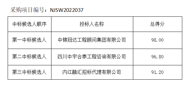 內江市水務有限責任公司招標代理機構服務供應商采購項目評標結果公示